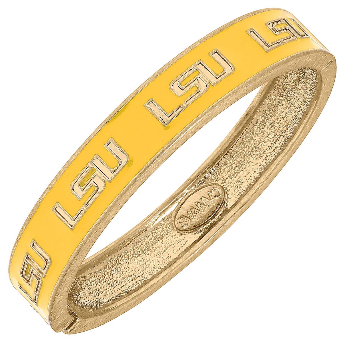 Add a splash of team spirit to your game day outfit with the LSU Logo Enamel Hinge Bangle. It features an enamel material with worn gold plating and team logo embossed around the bangle. Wear one, or build a stack with our other enamel bangle styles or Enamel Claudia bangle.