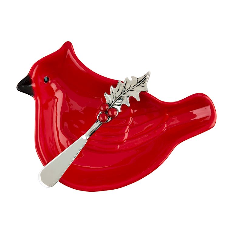 The Mud Pie Cardinal Tidbit Dish Set features a hand-painted ceramic dish paired with a metal spreader. The ceramic dish, measuring 5 1/2" x 6 1/2", is ideal for serving appetizers or small treats. Accompanied by a 5 1/2" spreader with a cast aluminum berry handle, this set combines functionality with style. The charming cardinal motif and sturdy materials make it an elegant and practical addition to any kitchen or dining area. Elevate your snack presentation with this delightful and durable tidbit dish set.