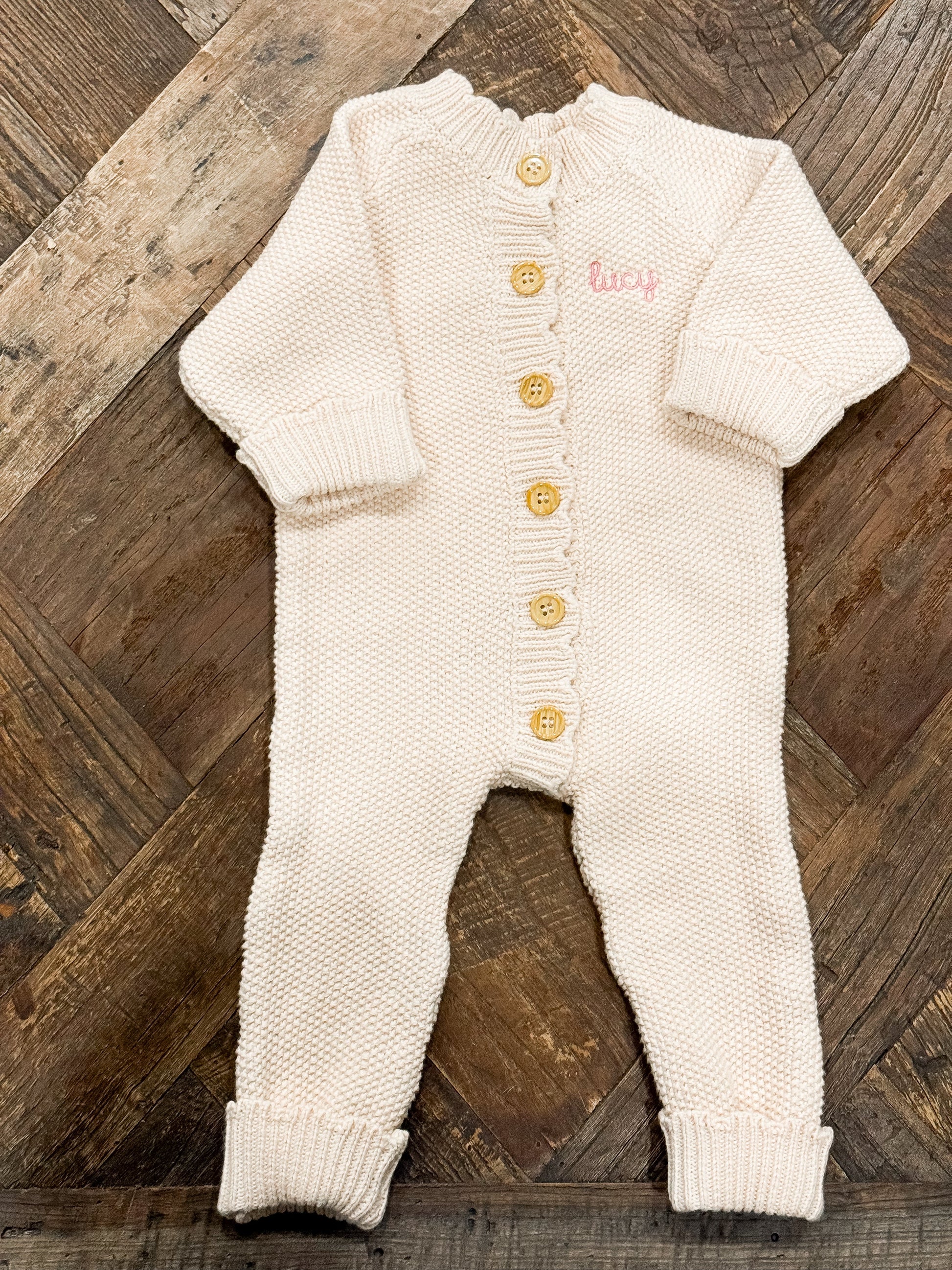 Elegant, timeless, and truly heirloom-worthy, our Scallop Knit Button-Up Romper. Makes a perfect gift for you new arrival. The charming scalloped edging and classic button-up silhouette elevate this romper into a keepsake garment your customers will treasure. The neutral cream color pairs beautifully with our roll neck sweaters and long sleeve knit rompers, making it easy to create layered, coordinated outfits for cooler seasons, special occasions, or styled photoshoots.
