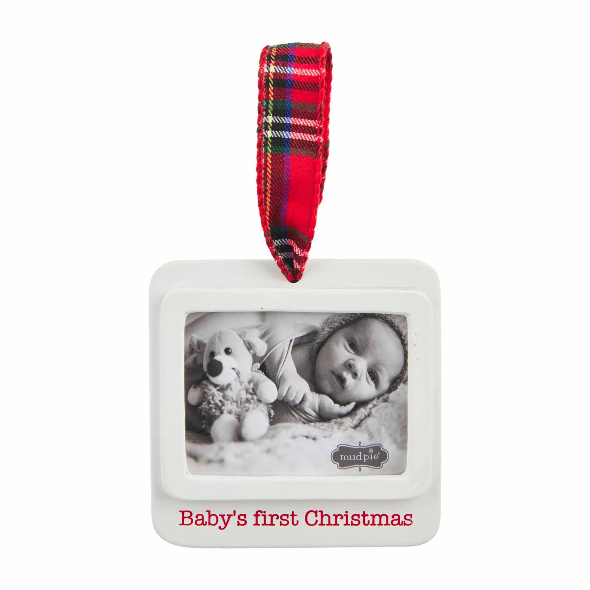 The First Christmas Handprint Ornament kit is a true memory maker. The two-piece set comes with a ceramic photo ornament with a tartan loop hanger; the front reads "Baby's first Christmas."