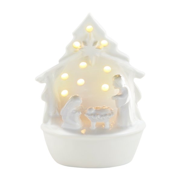 Mud Pie's Light-Up Nativity Sitter is a beautifully crafted ceramic figurine that adds a touch of elegance to your holiday decor. This nativity sitter features intricate pierced holes that allow LED lights to shine through, creating a warm and inviting glow.