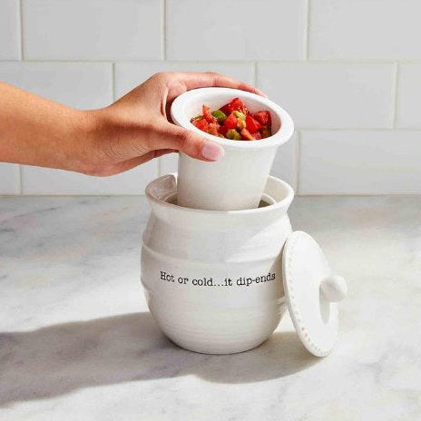- Our Warming and Cooling Dip Holder is essential for all my fellow dip lovers. The ceramic server comes with a lid that holds ice or hot water to chill or warm dips. The dip holder reads "Hot or cold… it dip-ends" on the center.