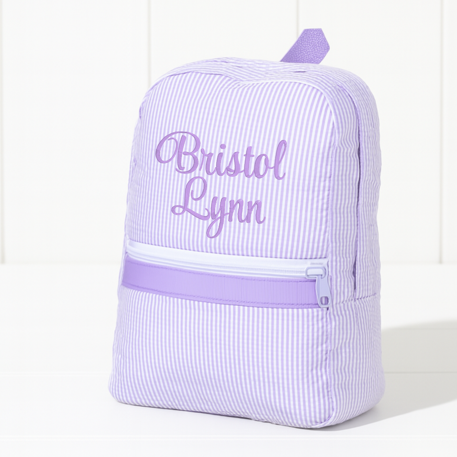 Monogrammed Lilac Seersucker Small Backpack
