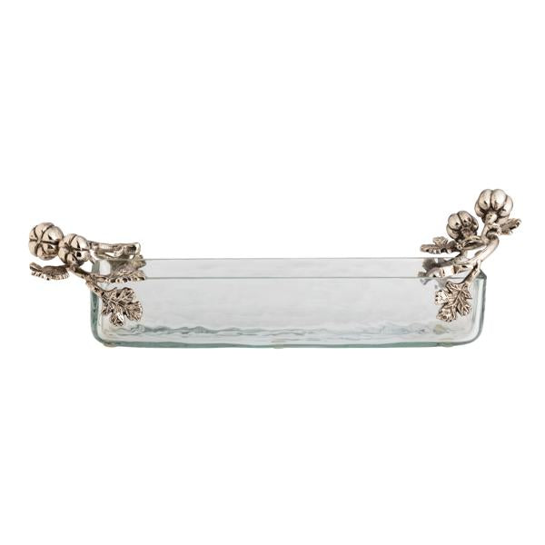 Elevate your autumn gatherings with this exquisite Pumpkin Cracker Dish, a perfect blend of elegance and functionality. Crafted from high-quality glass, this dish showcases a sleek, elongated design measuring 3 1/2" x 13", ideal for serving an array of crackers, snacks, or hors d'oeuvres. The standout feature is its beautifully detailed cast aluminum pumpkin side handles, adding a touch of seasonal charm and sophistication to your table setting. Whether you're hosting a festive dinner or enjoying a cozy night in, this dish is sure to impress your guests and enhance your dining experience. Its durable construction ensures long-lasting use, while the artistic design makes it a delightful centerpiece for any occasion.