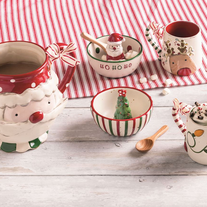 Delight in the festive charm of this Christmas Tree Candy Dish, a 2-piece set that brings holiday cheer to your home. Crafted from durable hand-painted stoneware, this candy dish features a beautifully detaiLED dimensional attached figurine, adding a whimsical touch to your holiday decor. .